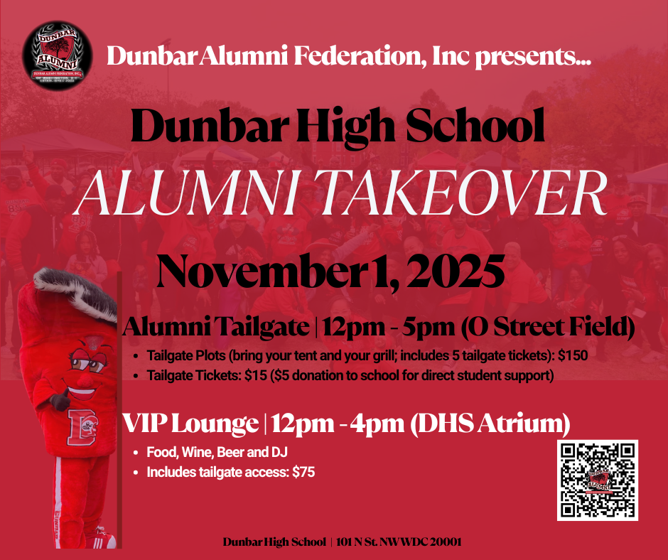 Dunbar High School’s Homecoming game may have been cancelled, but that is not going to stop the alumni from taking over the school. Join us for a twist on the Annual Alumni Takeover, with a DAY PARTY.